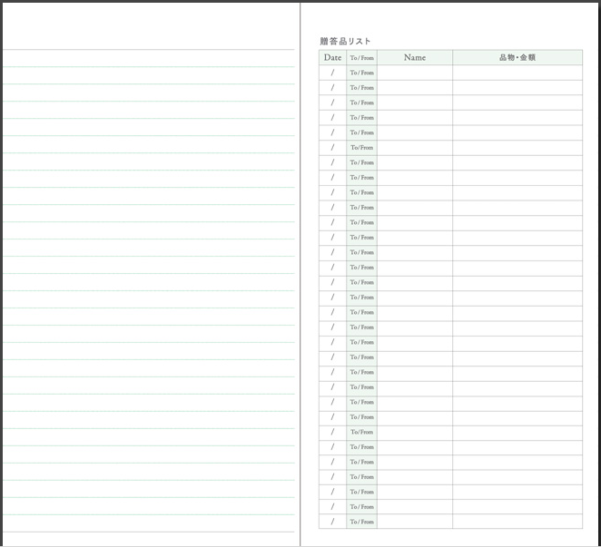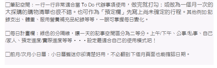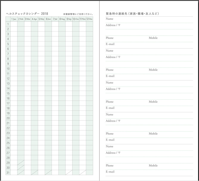 內容:年曆、年行事曆、月間+週間計劃表(2017年10月2019年1月)、橫線筆記、贈回禮列表頁、建康管理頁、緊急連絡人頁、其他連絡人頁、銀行/保險記錄頁、ID/密碼記錄頁、日本地下鐵路線圖、個資頁